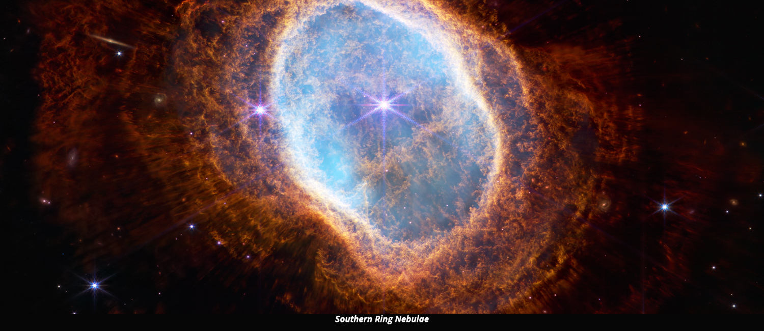The Southern Ring Nebula, located about 2,500 light-years away in the constellation of Vela. Also known as the Eight-Burst nebula, this planetary nebula has a diameter of about 0.5 light-years.
